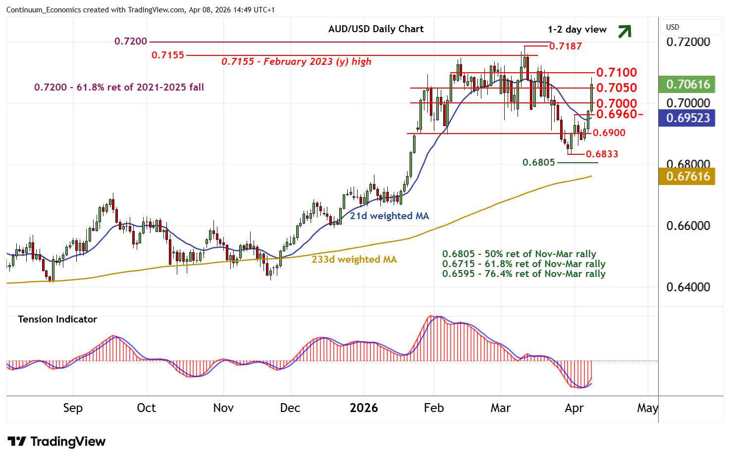 14:40 BST – Anticipated gains have extended to congestion resistance at 0.7050, where unwinding overbought intraday studies are prompting consolidation. Daily readings have turned higher, highlighting room for continuation towards further congestion around 007100. But negative weekly charts should limit any immediate break above here in consolidation beneath critical resistance within the 0.7155 – 0.7187 range. Meanwhile, support is raised to congestion around 0.7000 and extends to the 0.6960 weekly high of 1 April. This range should underpin any immediate setbacks.