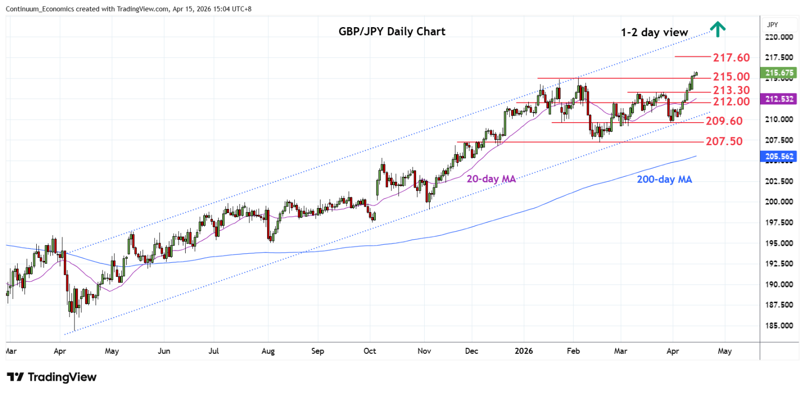 07:15 GMT – Break above the 215.00 February high see prices extending the underlying bull trend from 2011 low. Higher will see room for further extend gains within the bull channel from the April 2025 year low to the 216.00 high of July 2008 high and the 217.50, January 2008 year high. Meanwhile, support is raised to 215.00/213.30, February and March highs which should underpin. Would take break here to fade the upside pressure and see room for deeper pullback to retrace gains from 207.50 February current year low.
