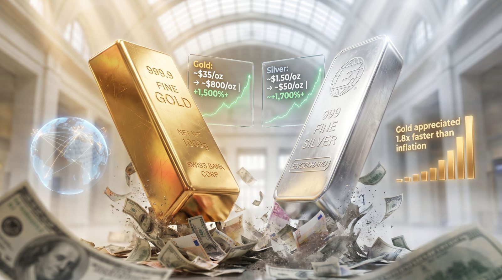Gold ~$40/oz (post-Nixon shock) ~$850/oz ~2,000%+