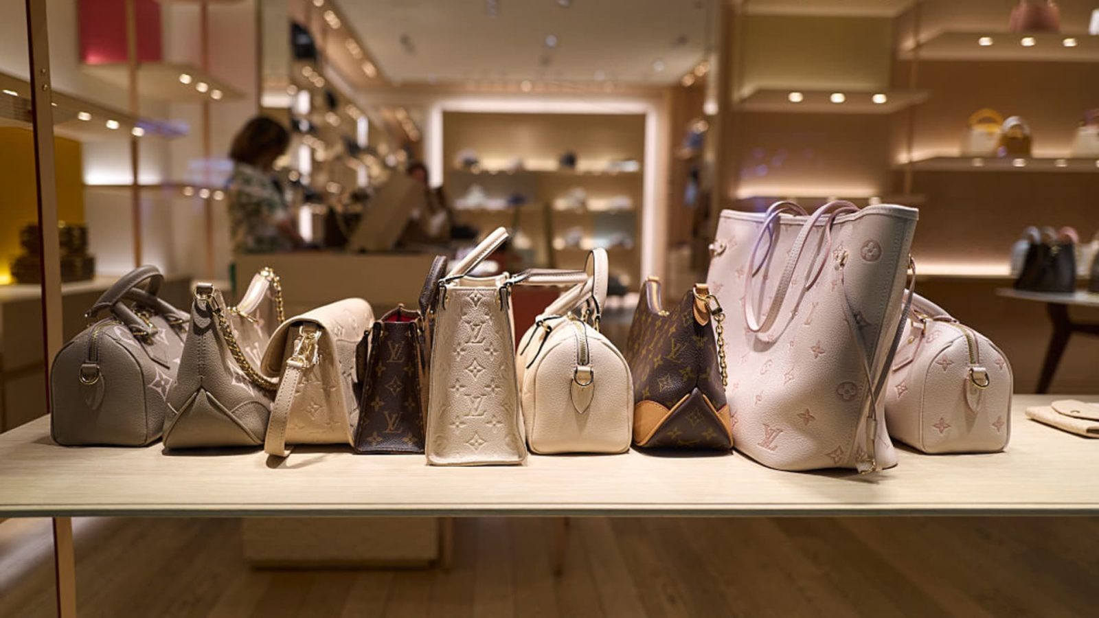 A selection of Louis Vuitton handbags is neatly arranged on a shelf inside a luxury boutique in Bari, Italy, on July 2, 2025. (Photo by Matteo Della Torre/NurPhoto via Getty Images)