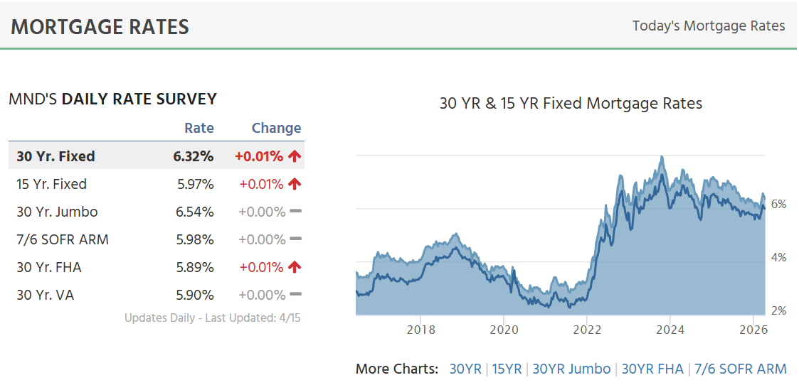 Mortgage rates are holding steady as of April 16, 2026, with the 30-year fixed rate hovering around 6.32% and showing only a slight daily increase. After weeks of sharp swings driven by global tensions, the market now shows signs of stabilizing, offering borrowers a clearer picture than earlier this month.